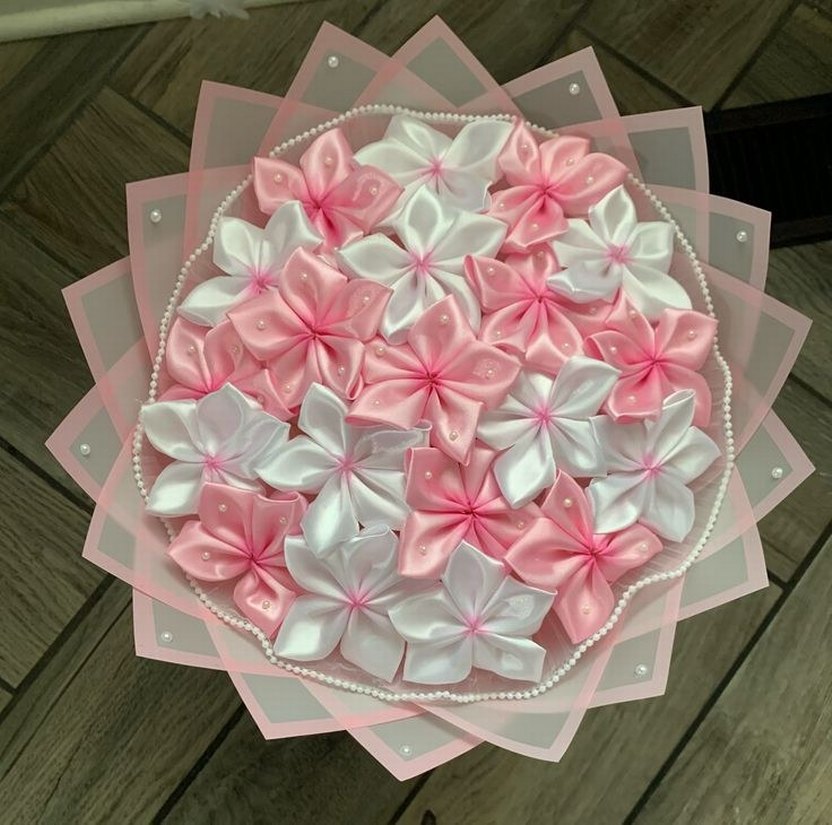 Yumuşak pembe ve beyaz saten çiçeklerden oluşan, küçük incilerle süslenmiş el yapımı zarif bir buket. istediğiniz renkte buket olustura bilirim