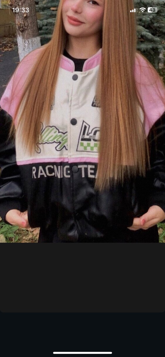 Fitted kesim, uzun kollu biker ceket, sentetik kumaştan, pembe ve siyah pastel tonlarda baskılıdır. Düğmeli ve önünde 'RACNICOTE' yazısı bulunur.