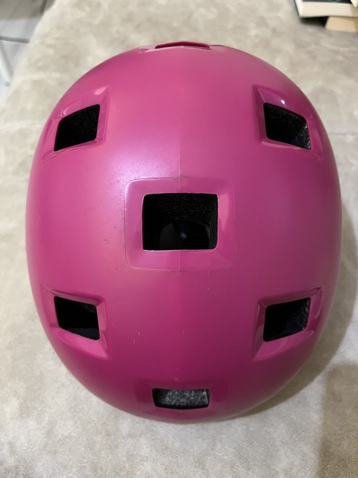 Plastik malzemeden yapılmış, Velcro kapamalı pembe biker tarzı motosiklet kaskı. Çoklu havalandırma delikleri bulunur. 5 10 yaş grup çocuklar icin