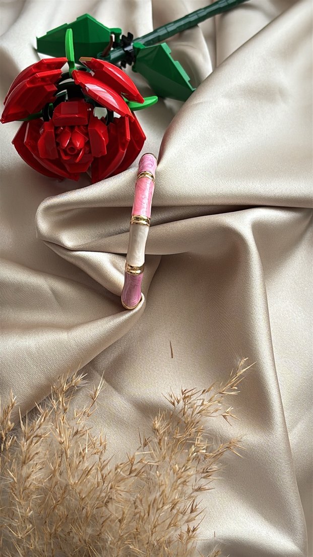 Pembe bohem tarzda, bileklik. Pastel tonlarıyla günlük kullanım için uygun, retro Paris havası katıyor.