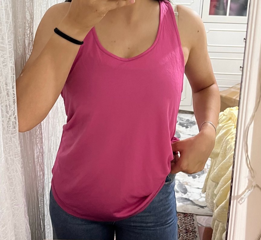 Pembe renkli, V yaka ve kolsuz kadın atlet. Rahat kesimi ve ipeksi dokusuyla günlük ve sokak stiline uygun, şık ve rahat bir tasarım.