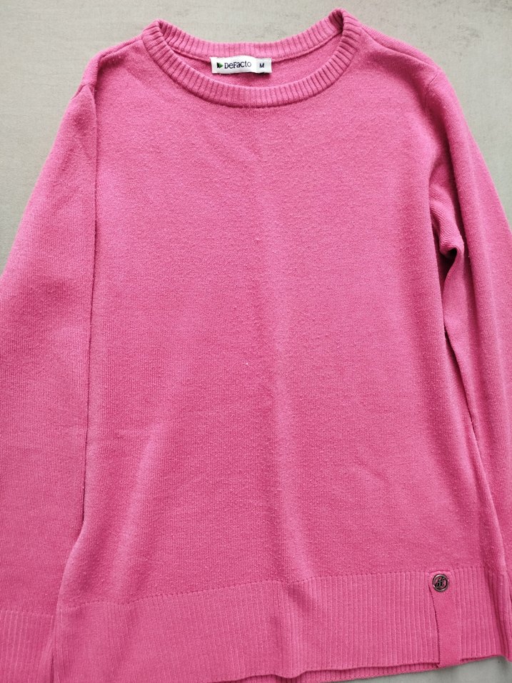 Pembe renkli kadın triko kazak, bisiklet yaka ve uzun kolludur. Yumuşak ve sıcak dokuda, bol kesim ve normal boyda, günlük kullanıma uygundur.