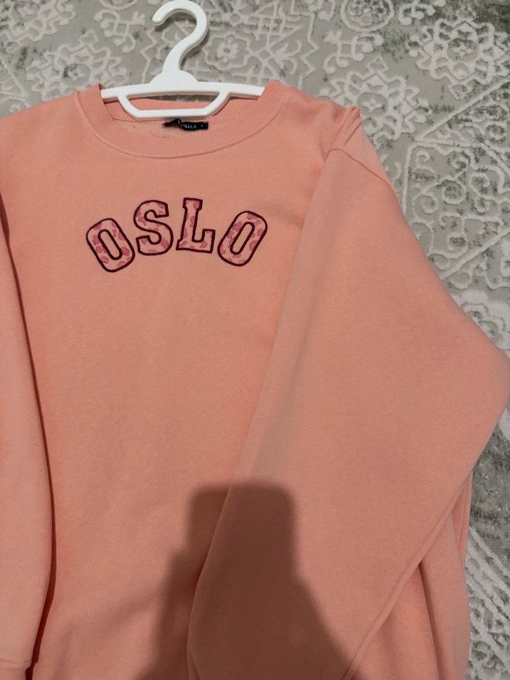 Pembe renkte, uzun kollu ve bisiklet yaka olan bu sweatshirt, yumuşak sentetik kumaştan üretilmiştir. Üzerinde "OSLO" baskısı vardır ve rahat, şık bir görünüm sunar.