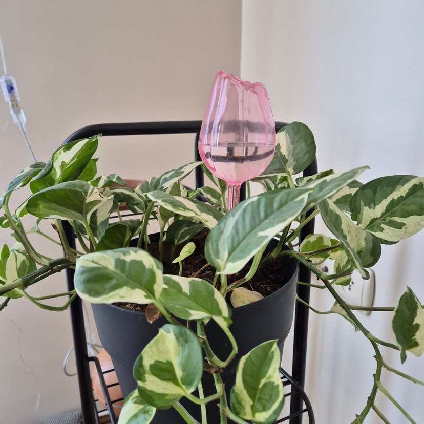 Pembe renkte, iç mekan bitkilerinin toprağını nemli tutmaya yardımcı olan bitki sulama aracı.