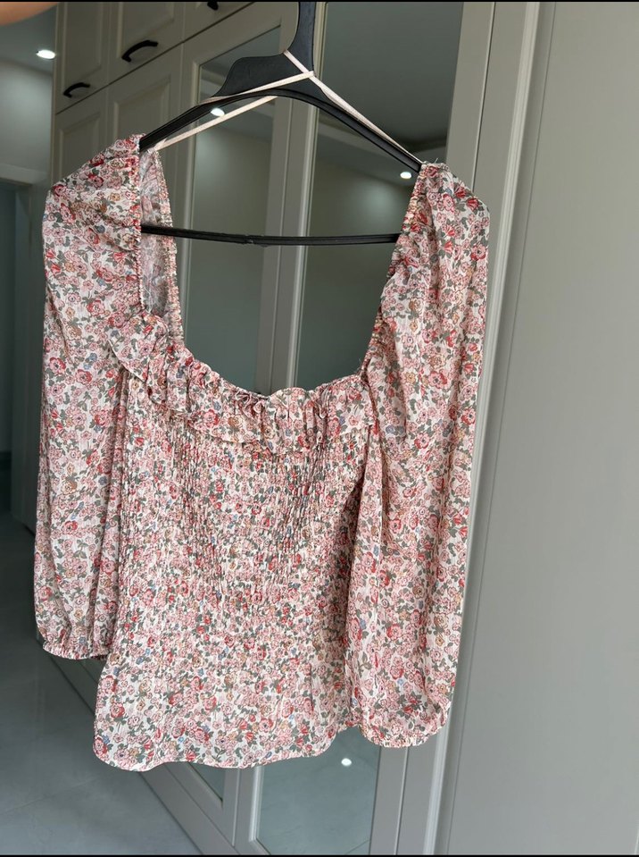Pembe baskılı, uzun kollu, straplez ve bol kesim bohem bluz, günlük kullanım için uygun. Şifon.