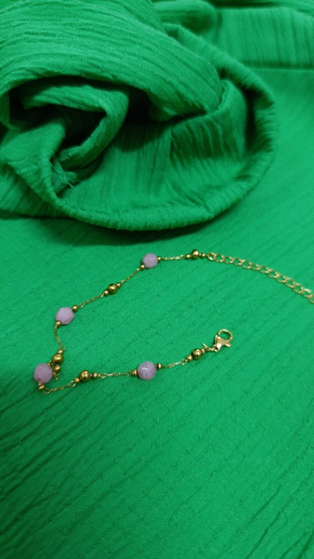 Kadın bileklik, zincir detaylı ve pembe boncuklu sade bohem tarzda, günlük kullanıma uygun altın renkli tasarım.