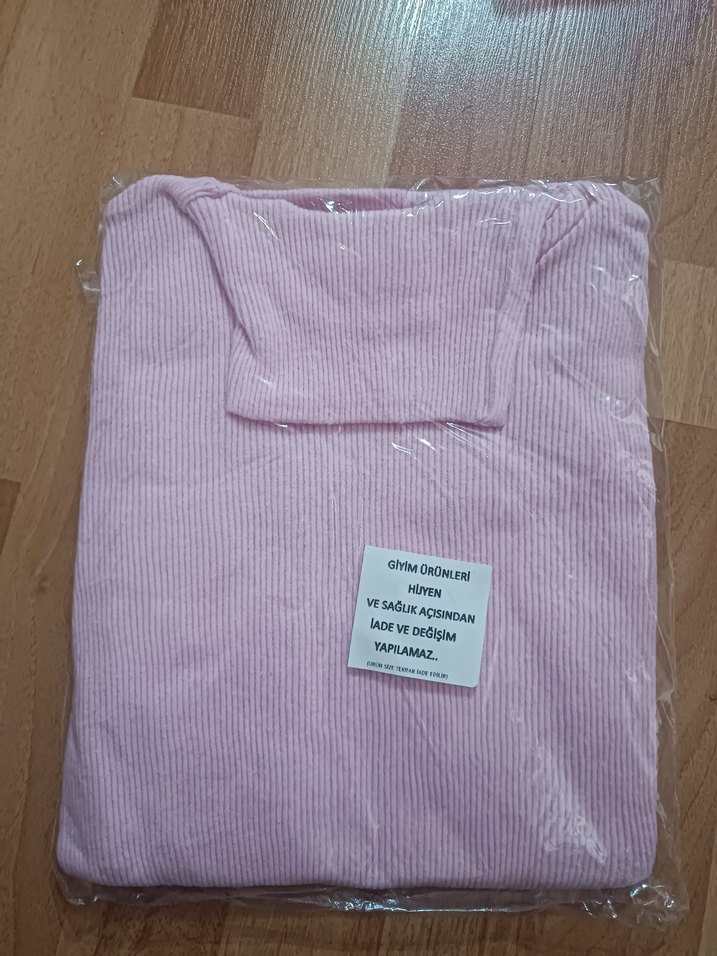 Pastel pembe renkte, yumuşak ve fitilli kumaştan bayan bady Düz desensizdir ve üzerinde iade ve değişim yapılamayacağını belirten hijyen etiketi bulunur. pembe ve mavi renk kaldı son adetler