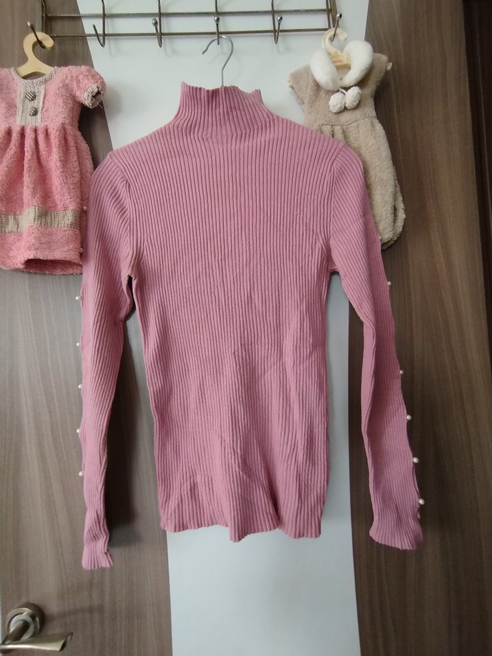 Pembe boğazlı ince triko kazak, uzun kollu ve kol detaylarında küçük inci süslemeleri ile rahat ve şık bir sokak stili sunar.