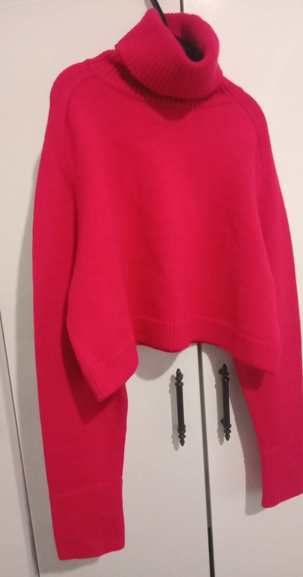 Pembe renkte, boğazlı ve uzun kollu örme kadın kazak. Rahat kesimi ve yumuşak, sıcak dokusuyla günlük kullanıma uygun.