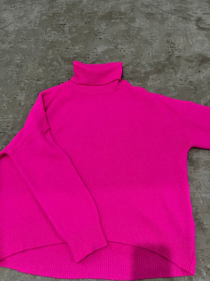 Pembe boğazlı kadın kazak, uzun kollu ve örgü dokusuyla rahat ve sıcak bir yapıya sahiptir. Salaş kesimi ve normal boyuyla günlük kullanıma uygundur. Standart bedendir