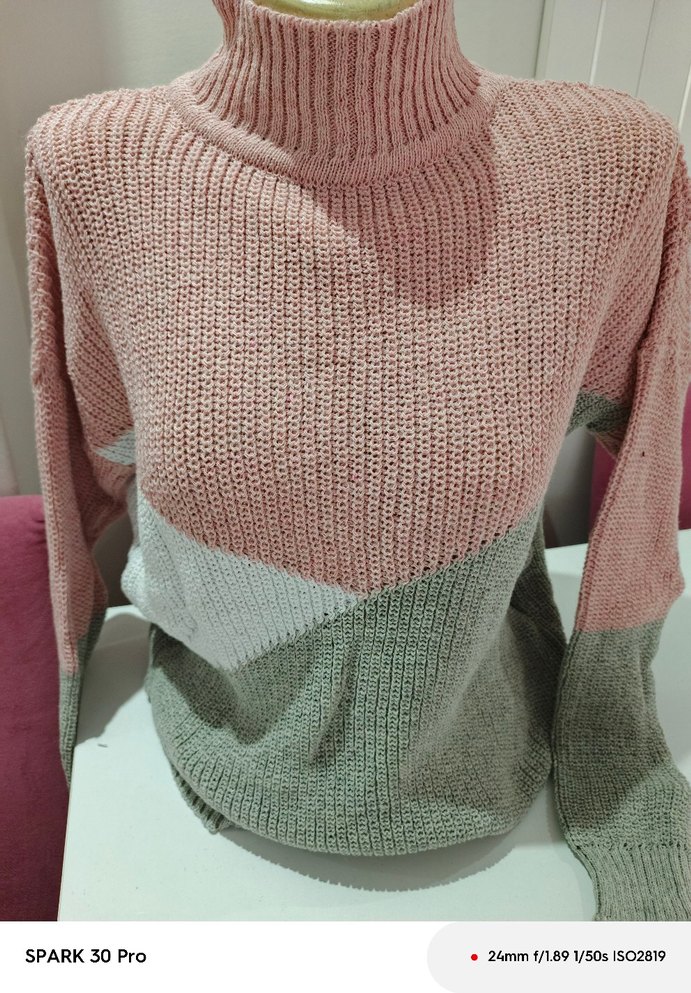 Boğazlı ve uzun kollu, rahat kesim örgü kazak. Pastel pembe, beyaz ve gri renk bloklu, kısa uzunlukta, trend günlük stil için uygundur.