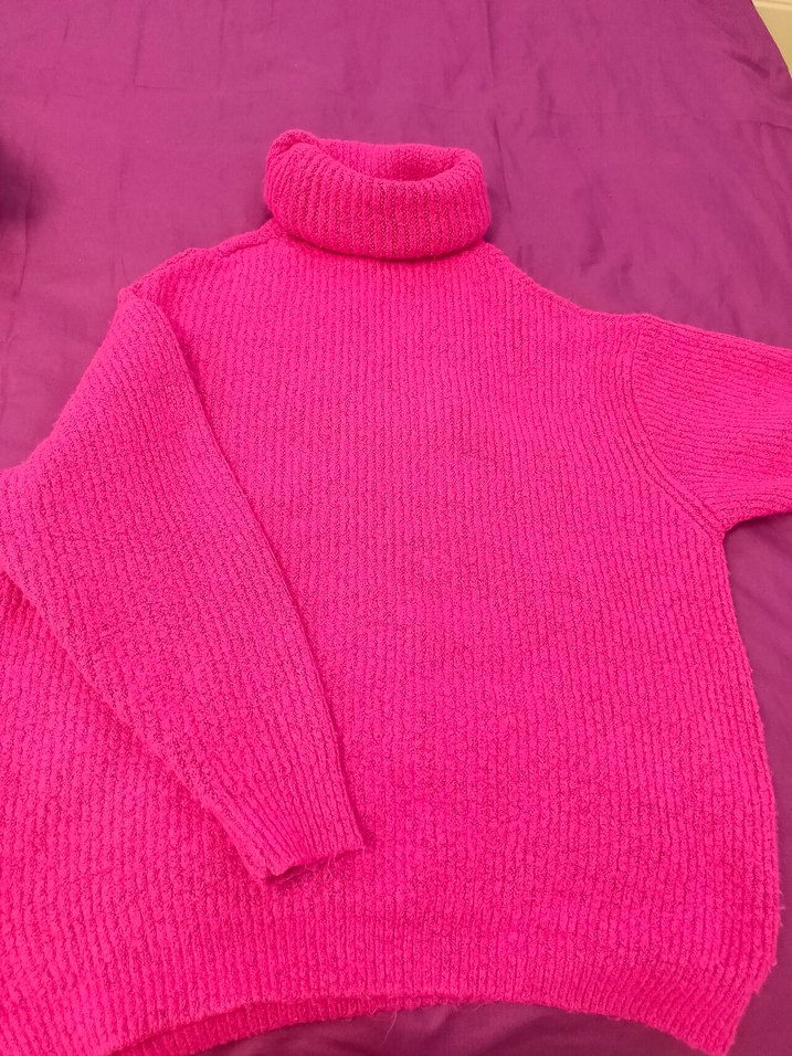 Pembe renkli, örgü kumaştan yapılmış boğazlı ve uzun kollu, rahat kesim kadın kazak. Günlük kullanıma uygun, sade ve sokak stiline uygun tasarım.