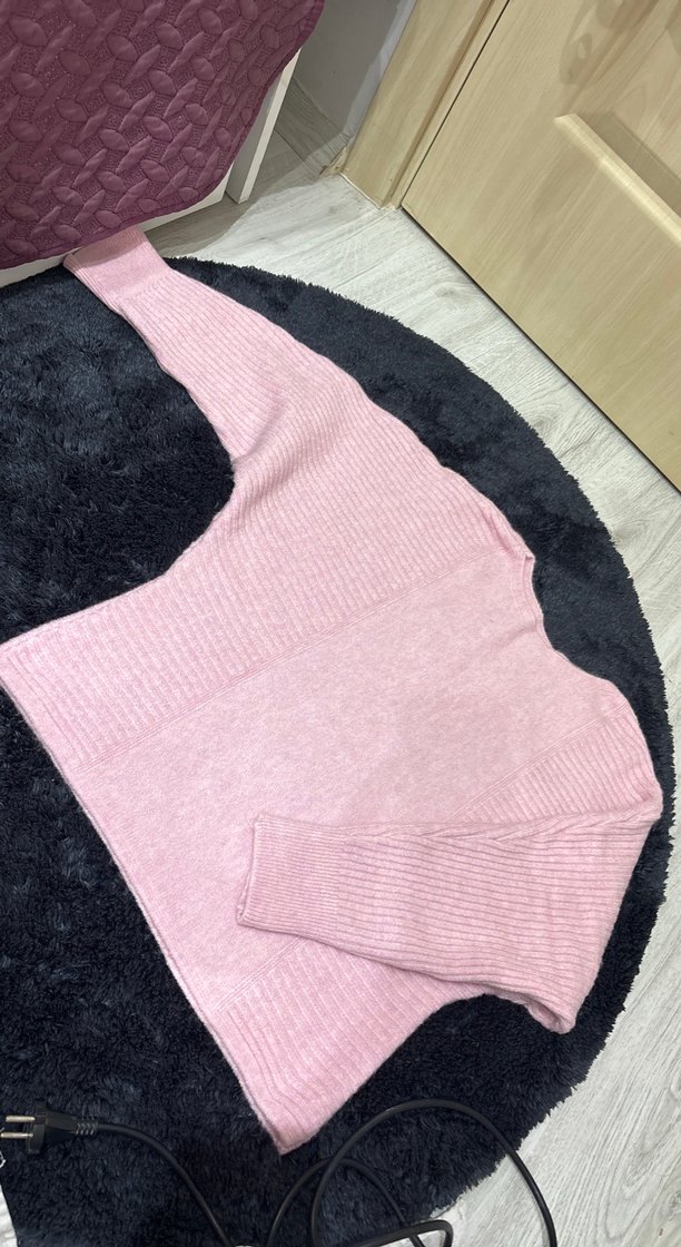 Pembe renkte, boğazlı ve uzun kollu örgü kadın kazak. Gevşek kesimi ve normal boyuyla günlük kullanıma uygundur.