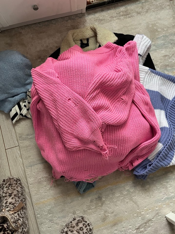Pastel pembe renkli, boğazlı, örgü kumaştan, bol kesim ve uzun kollu kadın kazak. Midi boyu ve rahat yapısıyla günlük ve sokak stiline uygundur.