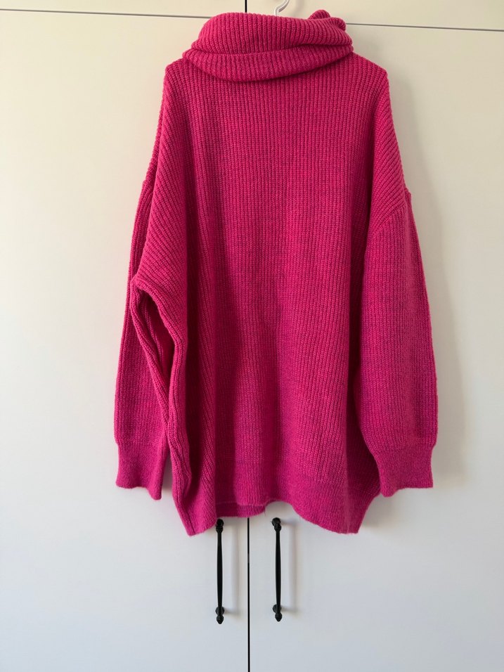 Örgü dokulu, bol kesim ve uzun kollu kadın mini elbise.Boğazlı yakası ve mini boyuyla rahat ve çağdaş bir tarz sunar. Canlı pembe renktedir. #pembe #elbise