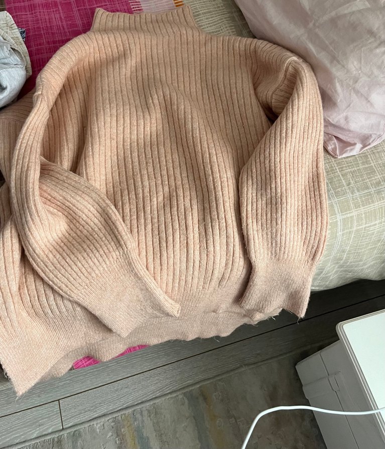 Pembe renkte, boğazlı ve uzun kollu örgü kazak. Rahat kesimi ve midi boyuyla günlük kullanıma uygundur.