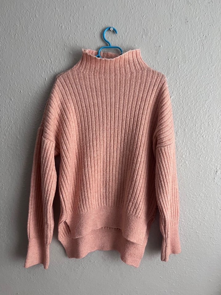 Pembe renkli, boğazlı, uzun kollu, bol kesim örgü kazak. Yumuşak dokusu ve pastel tonu ile gündelik kullanıma uygun rahat bir model.Standart beden.