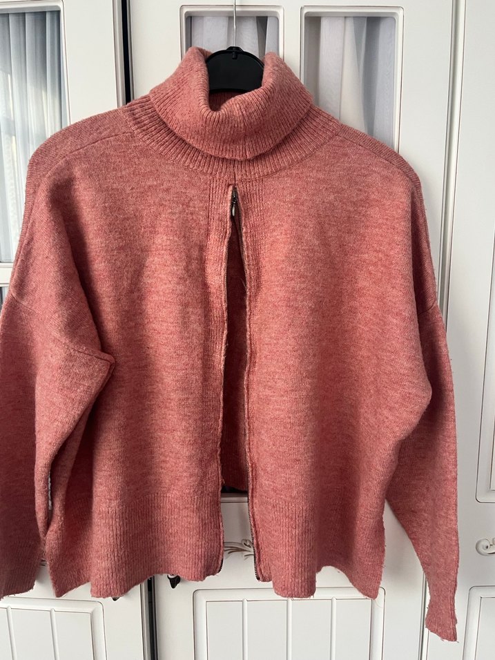 Yumuşak yün kumaştan, bol kesim, örgü dokulu, uzun kollu ve boğazlı pembe kadın kazak. Günlük kullanıma uygun rahat bir modeldir.