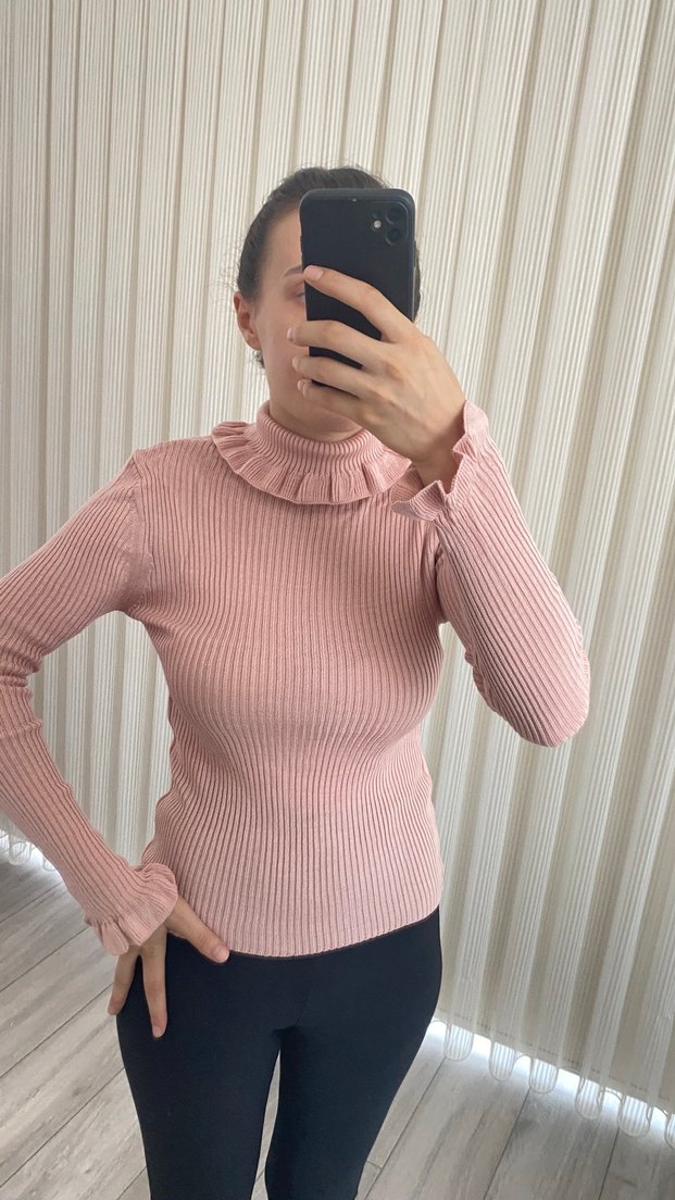 Pembe pastel renkte, boğazlı ve uzun kollu, vücuda oturan triko kadın kazak. Yumuşak örme kumaştan, günlük rahat sokak stili için ideal.