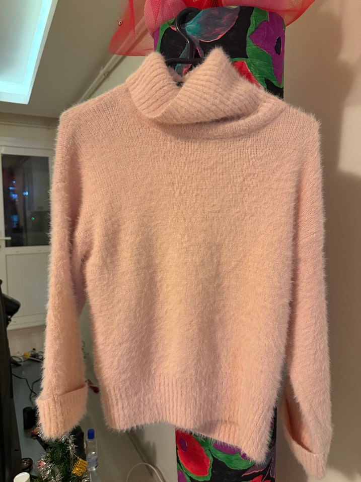 Pastel pembe renkli, boğazlı ve uzun kollu, örgü kumaştan yapılmış bol kesim kadın kazak. Günlük kullanıma uygundur.