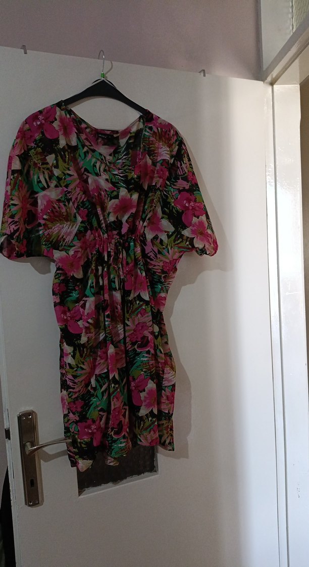 Gevşek kesimli, pembe tonlarında tie-dye desenli hamile tunik. Drapeli, V yaka ve kısa kollu, rahat sentetik kumaştan yapılmıştır.