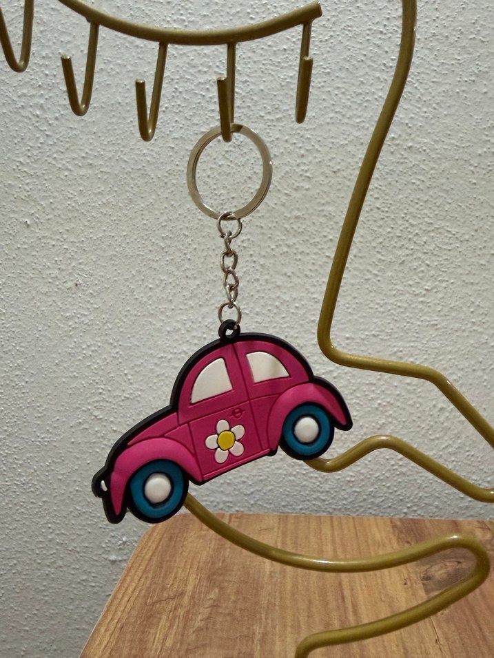 Zincir detaylı, renkli pembe araba figürlü anahtarlık, bohem ve retro tarzını yansıtıyor.