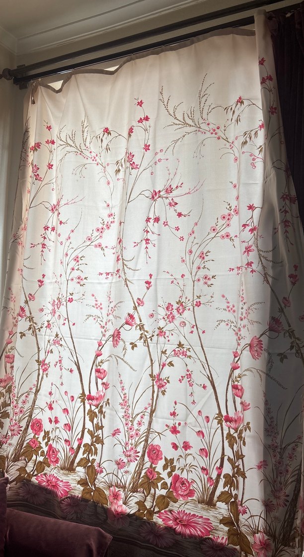 Yumuşak ve doğal bir dokunuş için bohem tarzda pastel pembe çiçek desenli perde.
