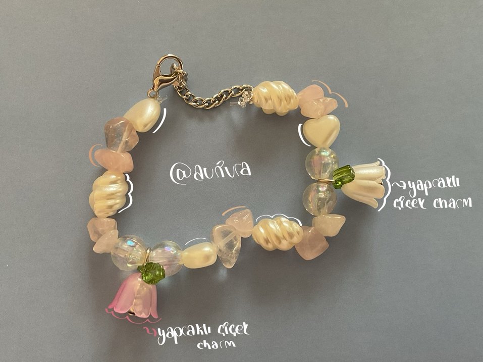Pastel pembe renkte, boncuklu ve çiçek desenli bohem tarzda bileklik. Üzerinde "yapraklı çiçek" yazılı şirin bir charm bulunur. El yapımıdır
