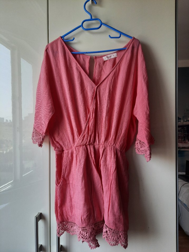 Pembe keten kumaştan, V yakalı, dantel detaylı, bol kesim bohem hamile tunik.