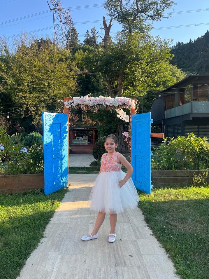Pembe bohem tarzda, dantel detaylı ve straplez askılı, fitted denim üst kısmı olan kız çocuk elbisesi. Hafif tie-dye deseni ve yumuşak tül etek kombinasyonu ile şık bir görünüm sunar.