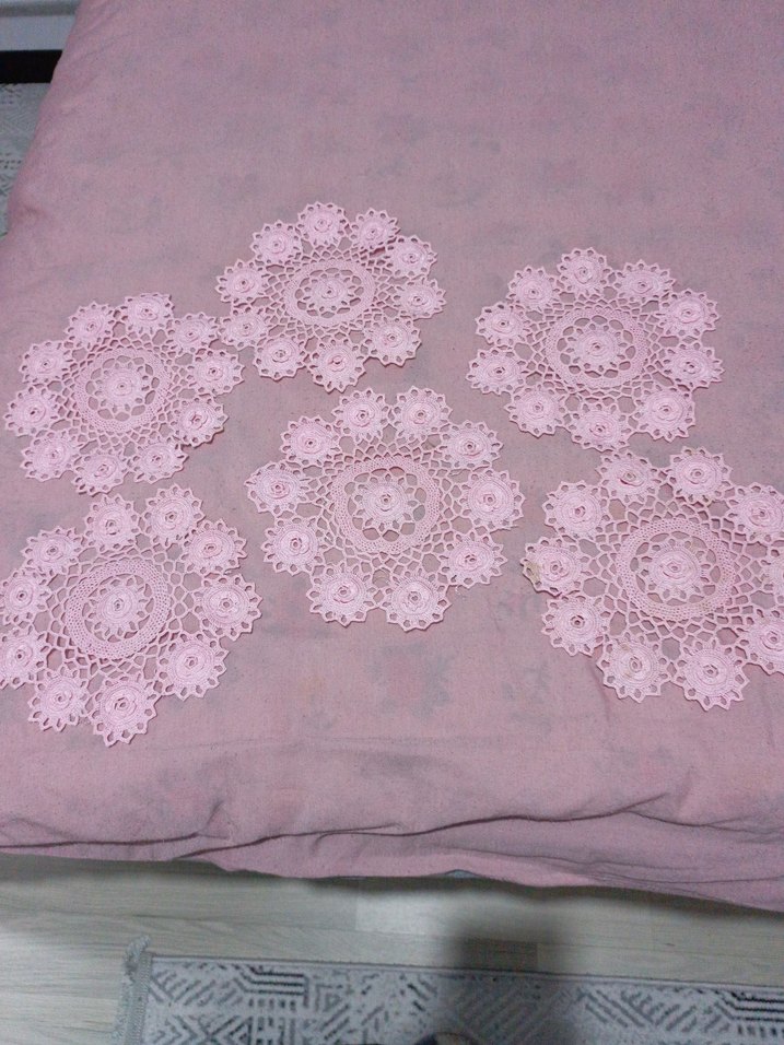 Beş adet pembe bohem tarzda, çiçek desenli dantel motifler, dekoratif kullanım için uygundur. bir tanesinde durmaktan oluşan küçük lekeler var resimde gösterdim floş ip olduğu için yıkanınca, çıkabilir