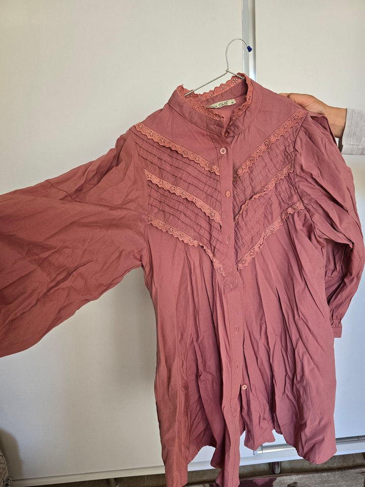 Geçişli pembe renkte, düğmeli, uzun kollu, bol kesim Bohem dantel detaylarıyla retro tarzını yansıtır.