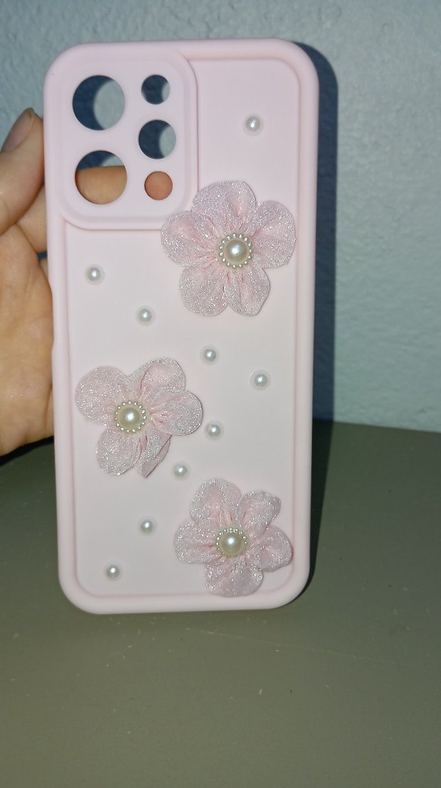 Pastel pembe renkte, boncuklu çiçek detayları ve yumuşak dokulu bohem tarzı redmi 12 telefon kılıfı.