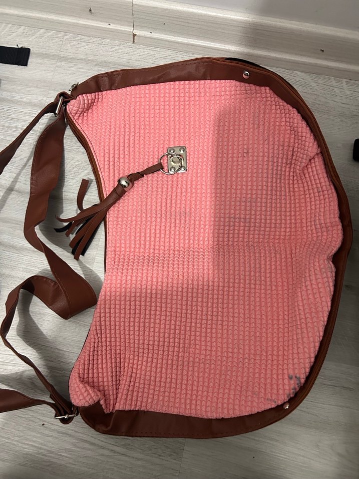 Pembe renkte, tokalı ve kahverengi detaylı sentetik kumaştan yapılmış bohem tarzı kadın çantası, günlük kullanım için uygun. Az lekesi var gözüküyor