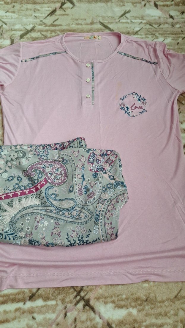 Kısa kollu ve mini boyda, bol kesim kadın pijama takımı. Pembe üstte küçük çiçekli 'love' yazısı, alt ise pastel tonlarda paisley desenli şort içerir. Rahat ve gündelik. lekesi yıkayınca cikar tril kimas