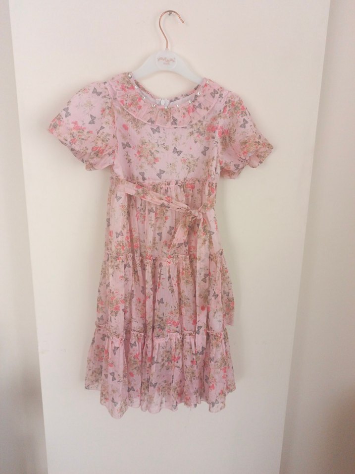 Pembe bohem kız çocuk elbise, tekne yaka ve kısa fırfırlı kollara sahiptir. Yumuşak sentetik kumaştan, bol kesim ve pastel baskılı deseniyle, belde bağlama detaylıdır.