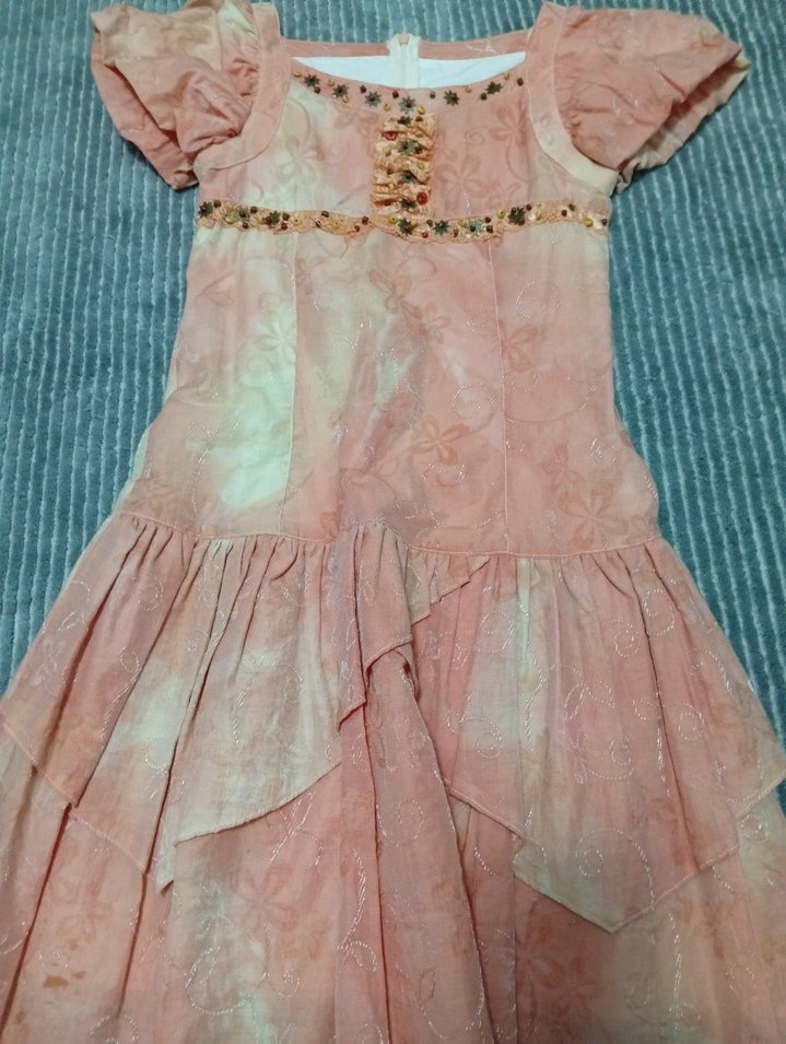 Fitted kesim, pastel pembe tie-dye desenli kız çocuk elbisesi. V yaka ve kolsuz, bohem tarzda fırfır detaylıdır.