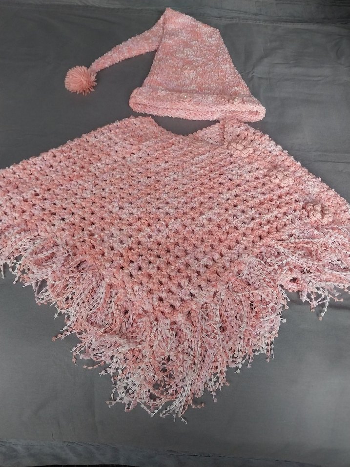 Pembe renkli örgü pelerin ve şapka, bol kesim ve nakış detaylarıyla bohem tarzını yansıtıyor. Püsküllü uçları bulunur.