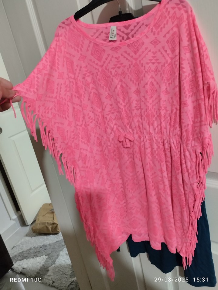 Renkli tie-dye desenli, salaş kesim pembe pelerin. Drapeli, askılı kollu, yuvarlak yaka ve püskül detaylı bohem tarzda.