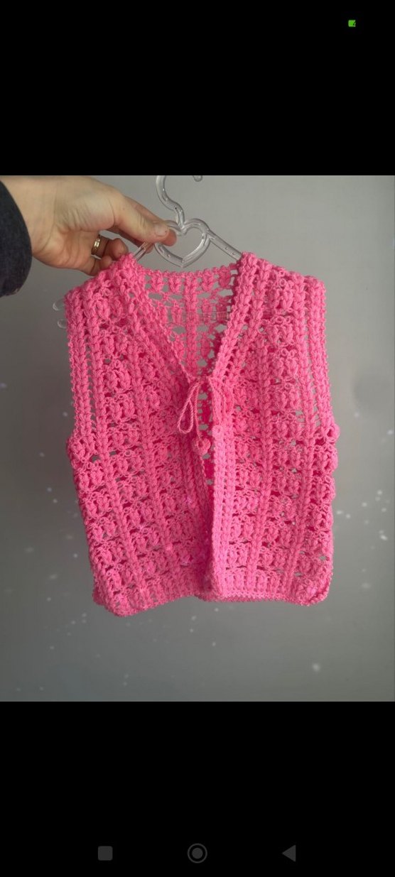 Pembe, V yaka, kolsuz ve bol kesim olan bu örgü yelek, bohem tarzda yumuşak dokulu el örgüsüdür.