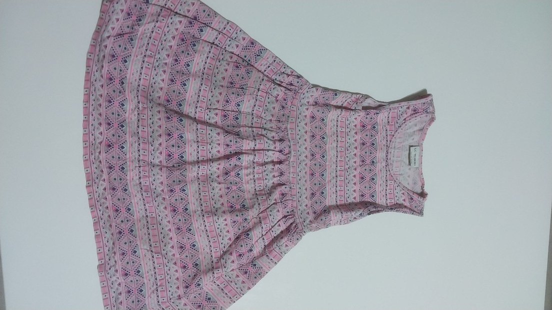 Pembe pastel tonlarında bağlama desenli, bol kesim kız elbisesi. Fırfırlı detaylı, kayık yaka ve askılı kollu bohem tarz.