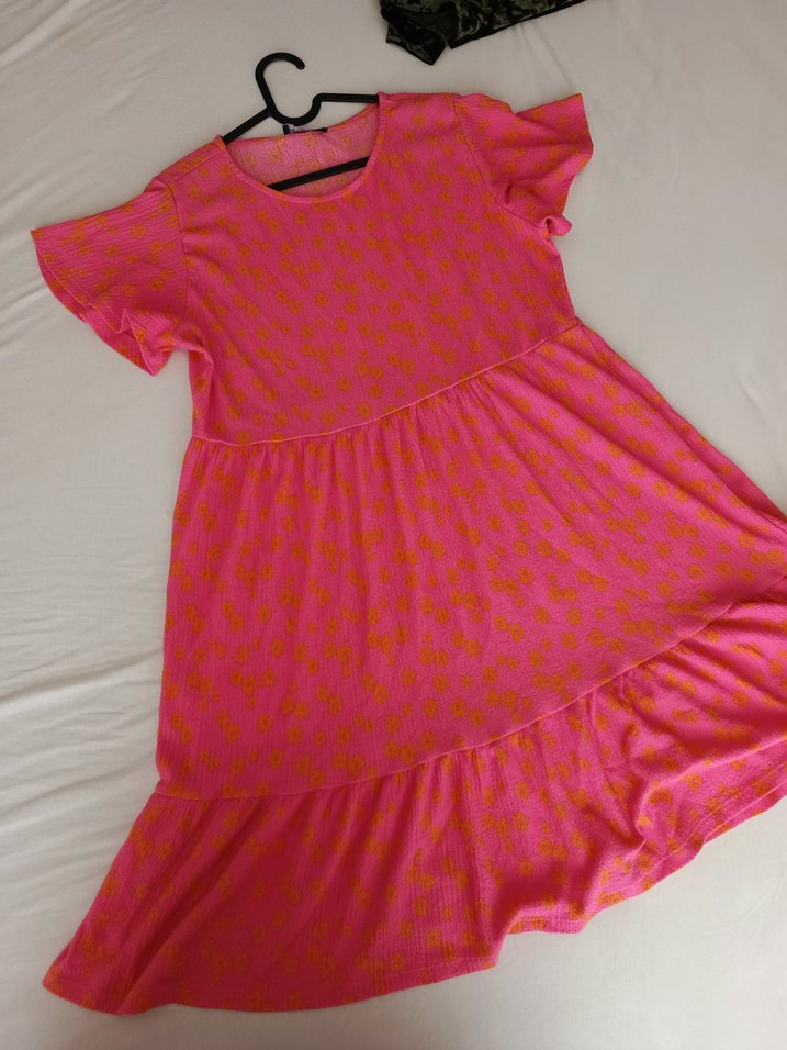 Pembe, bol kesim midi elbise, kısa kollu ve yuvarlak yaka. Fırfır detaylı ve pastel tonlarda batik desenli, yumuşak kumaştan. hamileler içinde uygun