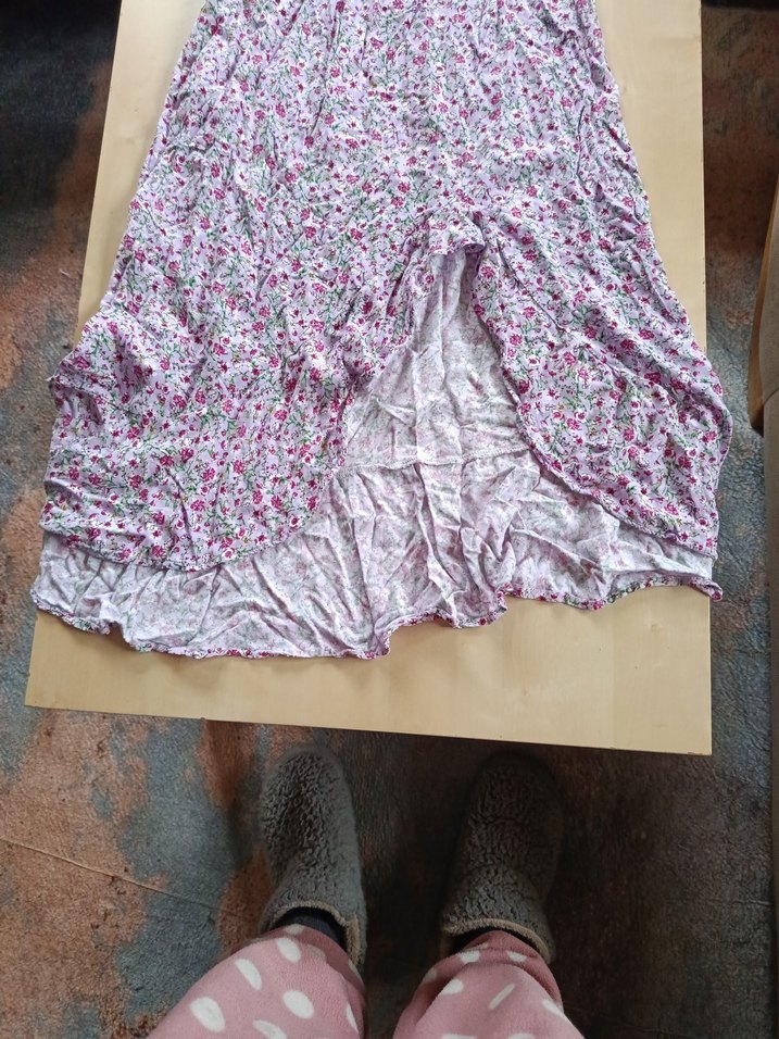 , drapeli tasarımı ve yumuşak sentetik kumaşı ile dikkat çeker. Pembe ve gri çiçek desenlidir, bohem tarz için uygundur.