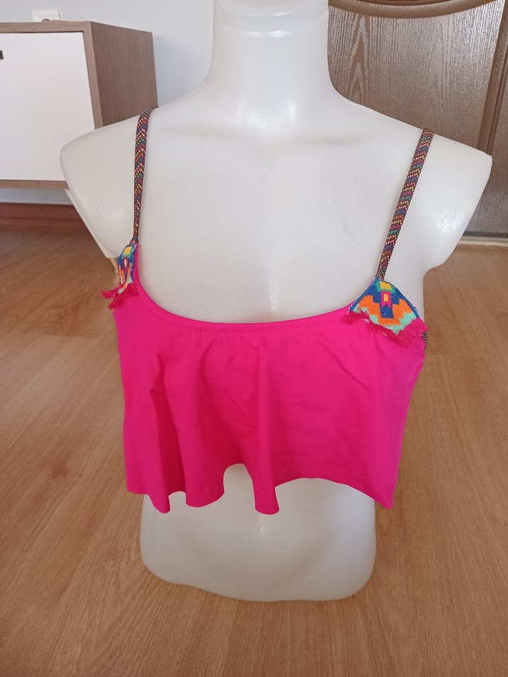 Pembe renginde, bağcıklı askılı ve salaş kesime sahip bohem tarz mini bikini üstü. Renkli batik desenli askılar ve fırfır detayları bulunur, plaj için uygun.