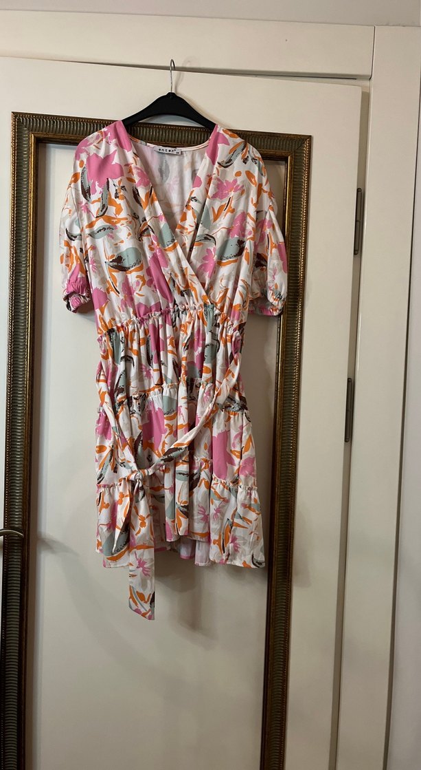 Pembe bohem tarzda, bağcıklı kısa mini elbise. Gevşek kesimli, pastel tonlarda batik desenlidir. Rahat ve hafif kumaştan yapılmıştır.