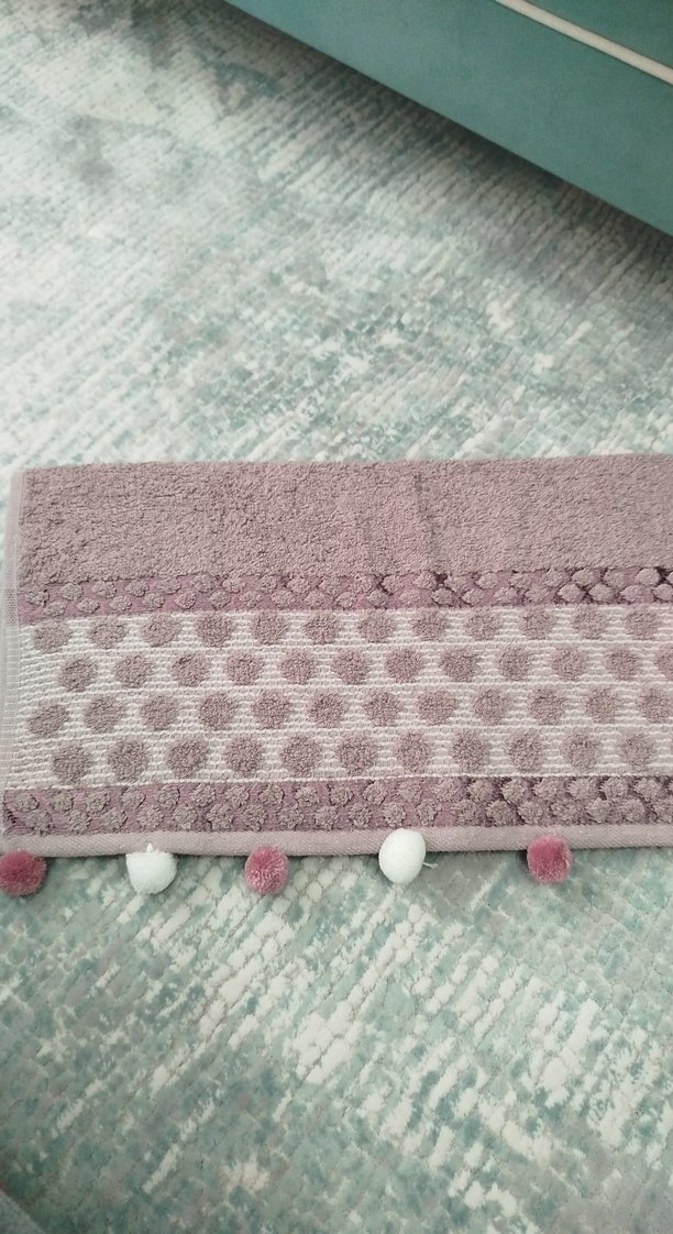 Pembe renkte, bohem tarzda nakışlı desenlere sahip, kenarında küçük ponpon süslemeleri bulunan pastel tonlarda yumuşak havlu.