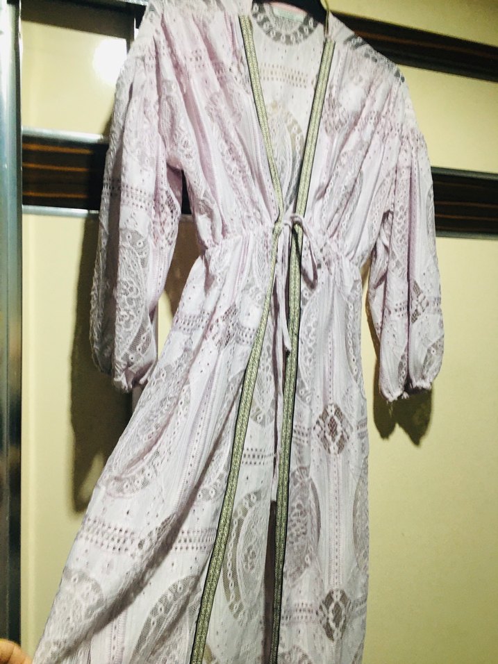Bu bol kesim, uzun boy kadın sabahlık, pastel pembe renkte ince nakışlı ve askılı kollara sahip. Bohem tarzı yansıtan hafif ve rahat bir parça.