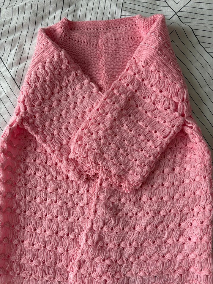 Pembe pastel renkte, bol kesim ve uzun kollu, bohem tarzda dokuma detaylı hırka