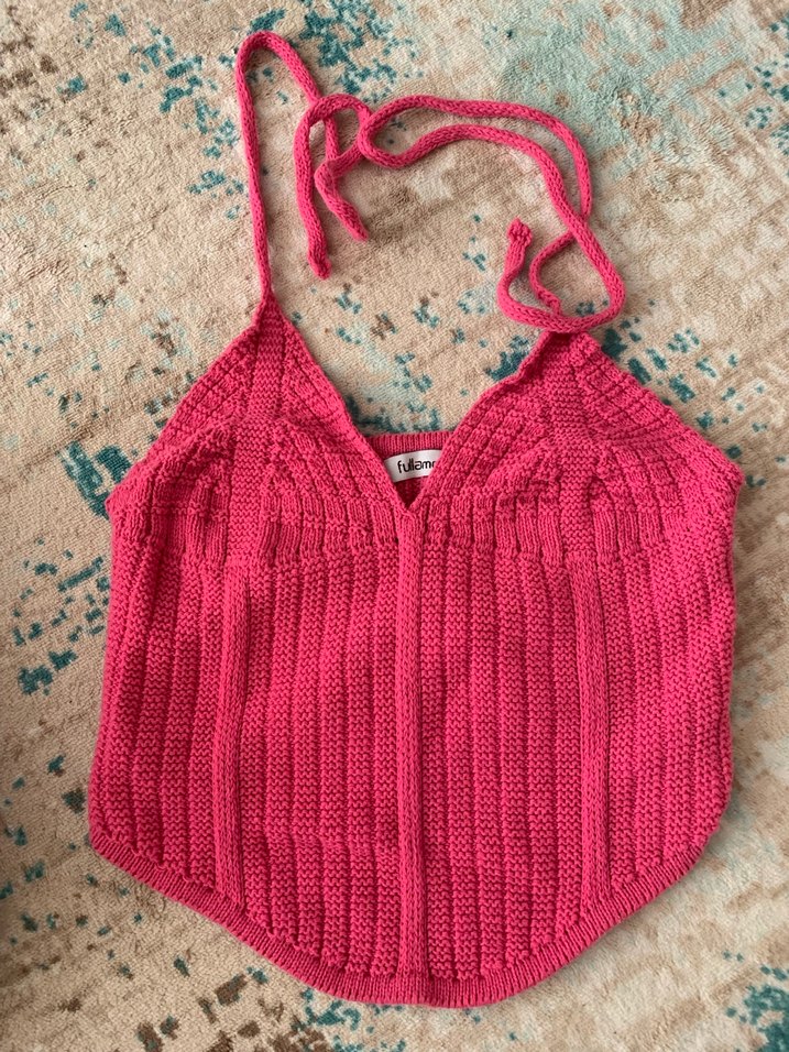 Pembe renkli, askılı ve straplez yaka detaylı, bol kesim bohem tarzda örgü bluz.