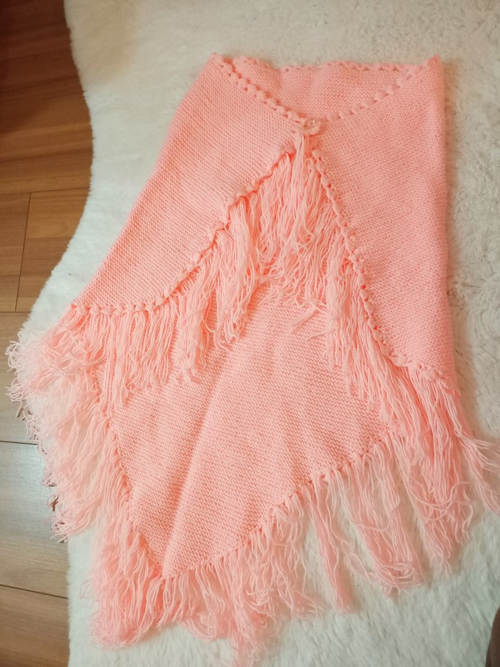 Pastel pembe renkte, püsküllü, örgü kadın panço. Rahat ve bohem tarzda, sıcak tutan bir tasarım.el örgüsü